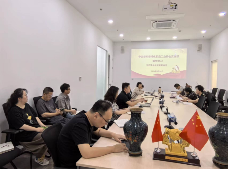 2024年5月30日上午,中国香料香精化妆品工业协会(以下简称“中国香化协会”)党支部根据《中国香料香精化妆品工业协会党纪学习教育实施方案》,第二次组织集中学习了习近平总书记5月23日在企业和专家座谈会上的重要讲话(以下简称“重要讲话”)。集中学习由颜江瑛理事长主持,协会全体人员参加学习。本次学习由办公室杨梅负责领读。