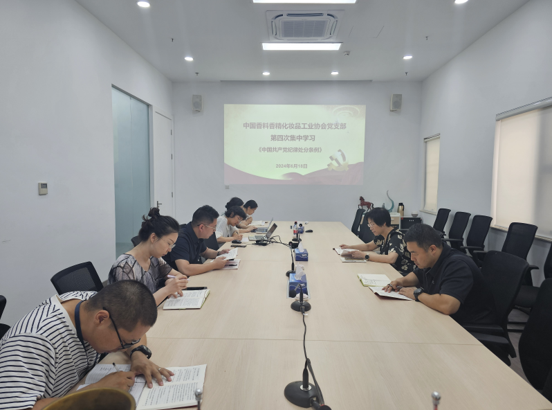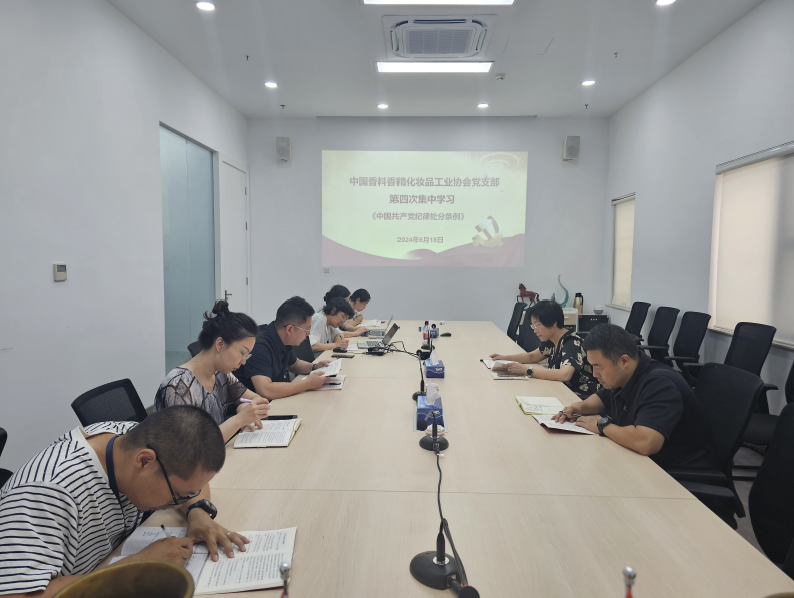 2024年6月18日上午,中国香料香精化妆品工业协会(以下简称“中国香化协会”)党支部根据党纪学习主题教育方案安排,组织第四次集中学习。集中学习由颜江瑛理事长主持,支部全体党员参加学习。