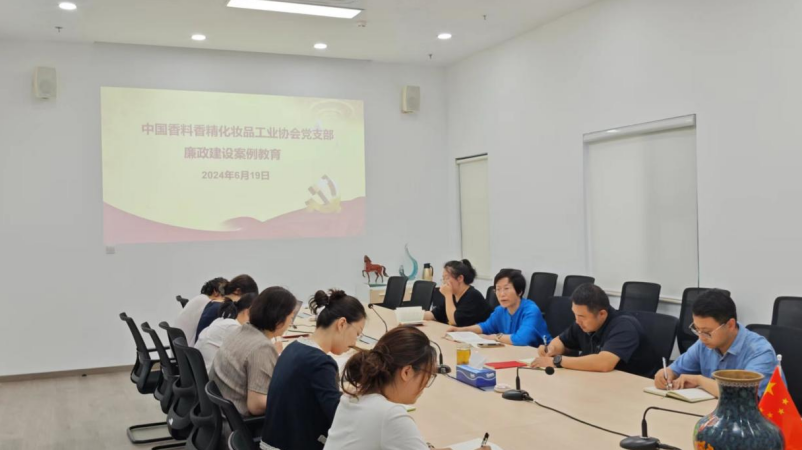 2024年6月19日下午,中国香料香精化妆品工业协会(以下简称“中国香化协会”)党支部组织廉政建设案例教育集中学习。集中学习由颜江瑛理事长主持,协会全体人员参加学习。