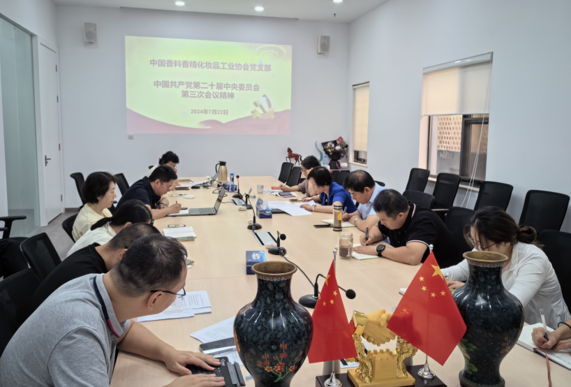7月22日,中国香料香精化妆品工业协会(以下简称“中国香化协会”)党支部颜江瑛理事长主持召开学习会,专题学习党的二十届三中全会精神。颜理事长作领学辅导,协会全体人员参加了集中学习。