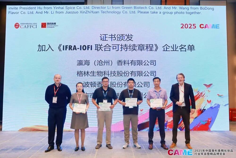国际日用香料协会(IFRA)主席Alexander Mohr和执行总监Sven Ballschmiede分享了《2025年IFRA-IOFI可持续发展报告》,剖析报告中的关键进展与丰硕成果,展示IFRA-IOFI可持续发展章程签署方在兑现章程承诺方面所取得的最新进展,彰显了行业共赴可持续未来的决心。随后,两位为此次加入IFRA-IOFI联合可持续章程的中国企业代表:瀛海(沧州)香料有限公司CEO朱晨、格林生物科技股份有限公司副总经理胡建良、波顿香料股份有限公司总经理助理王越、焦作市馨之源科技有限公司业务经理李蕾颁发证书。
