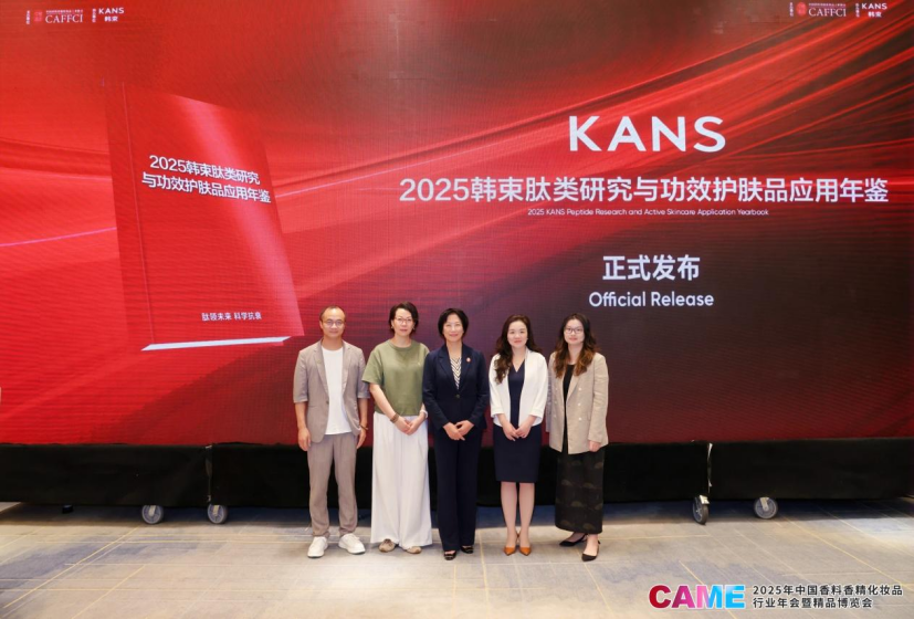 中国香料香精化妆品工业协会理事长颜江瑛、上海上美化妆品股份有限公司副总裁俞瑛、上海市皮肤病医院主任医师教授邹颖、未来迹传创始人刘李军、上海上美化妆品股份有限公司资深科学家钟烨共同发布了2025韩束肽类研究与功效护肤品应用年鉴。