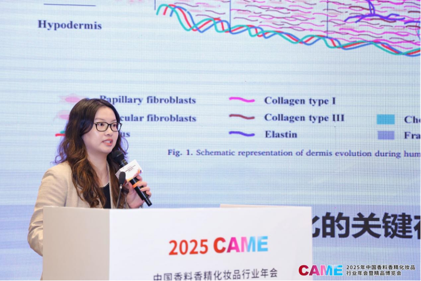 上海上美化妆品股份有限公司资深科学家钟烨以《韩束科技抗衰-功能价值升维之路》为题,系统阐述了皮肤老化的多重驱动机制与科学抗衰的前沿进展。她指出,皮肤衰老不仅源于时间顺序老化,更受到氧化应激、细胞通讯障碍、干细胞生态位退化等内在机制与外部环境的协同影响。在此背景下,多肽作为关键活性成分,凭借其在促进成纤维细胞功能再生、修复细胞外基质等方面的卓越功效,正成为全球抗衰护肤领域的核心技术路径。