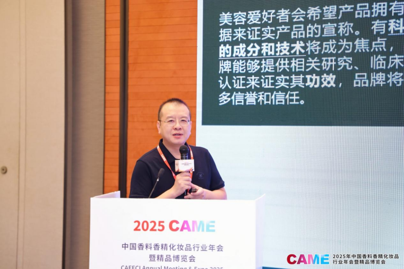 2025年9月27日上午,2025年中国香料香精化妆品行业年会暨精品博览会(2025CAME)化妆品创新发展前沿技术交流会,在南京扬子江国际会议中心集庆厅A成功召开。本次交流会汇集了知名企业、高校及科研机构的专家学者,共探化妆品创新发展前沿技术。贝泰妮集团研发副总裁王飞飞担任主持人,交流会共设置1项成果与应用发布及10个主题演讲环节,聚焦抗衰老科技、东方植物成分创新、重组胶原蛋白、糖生物学等前沿领域,共同探讨化妆品科技的创新路径与未来趋势。