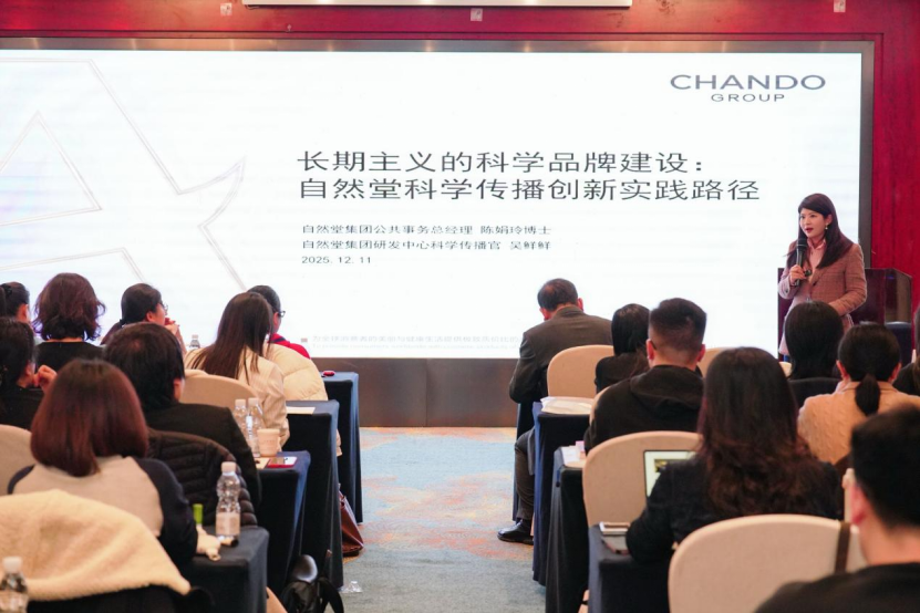 自然堂集团公共事务总经理陈娟玲博士与自然堂研发中心科学传播官吴鲜鲜共同带来《长期主义下的科学品牌建设:自然堂科学传播的创新实践路径》分享,陈娟玲博士从化妆品行业正从“营销驱动”向“科学驱动”转型的背景切入,结合自然堂以喜马拉雅为源头的科研探索与品牌建设真实案例,系统阐述了科学传播在构建品牌长期信任中的关键作用。吴鲜鲜深入解析了自然堂集团“皮肤科学、原料科学、产品科学”三大科研体系,并以自然堂自研“抗疲老”科技喜默因®与“MicroRNA诺奖研究应用”为例,展现了自然堂以科学语言回应真实肌肤问题,推动从实验室成果到生活场景的情感联结。