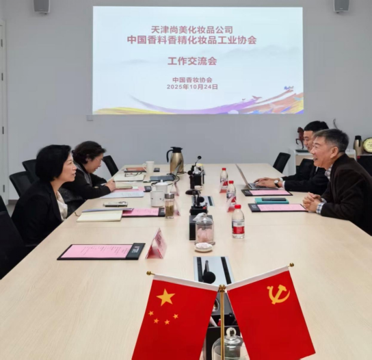颜江瑛理事长首先对创始人郭毅群一行的到来表示欢迎。创始人郭毅群介绍,今年天津尚美公司是第一次参加2025中国香料香精化妆品行业年会暨精品博览会,收获很多。公司人员与许多国内外一线品牌进行了洽谈交流,了解品牌商的需求,为企业发展提供了合作机会。公司连续三年举办了《中草药科技与化妆品应用》论坛,吸引了多所中医药大学、研发测评机构及研发人员、产品经理等参加,希望能够与协会开展合作,提升论坛的影响力,做一些对中国传统文化与中草药植物的应用有意义的事情。公司将继续参加2026年的精品博览会,积极投稿和参与2026年的科技大会等。