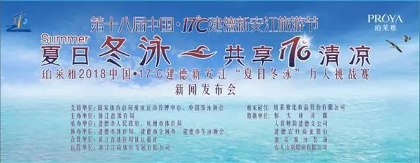 2018年7月16日,中国?建德17℃新安江“夏日冬泳”万人挑战赛新闻发布会在杭州举行,浙江省体育局、建德市人民政府、建德市体育局、赞助商珀莱雅相关领导以及皮划艇世界冠军出席了发布会。发布会主要介绍了本届赛事的筹备情况,同时举行了赞助商签约仪式。