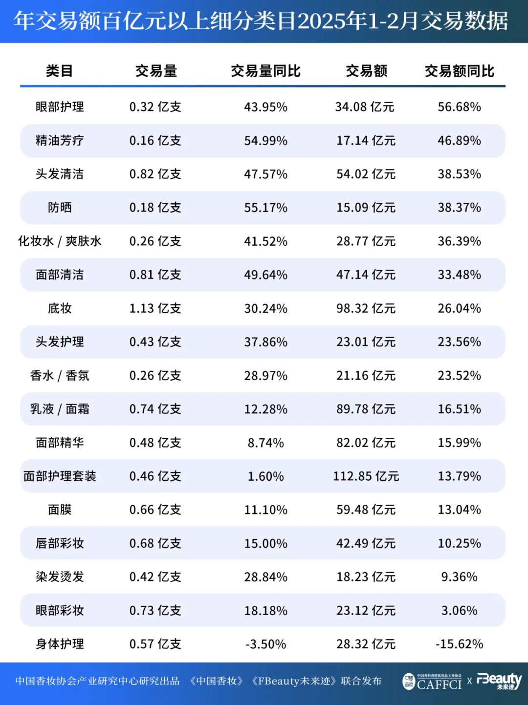 2025年1-2月,年交易规模100亿元以上的细分市场大部分保持正增长,尤其是眼部护理、精油芳疗、头发清洁、防晒、化妆水/爽肤水,面部清洁这几大细分市场,同比增长保持在30%以上。