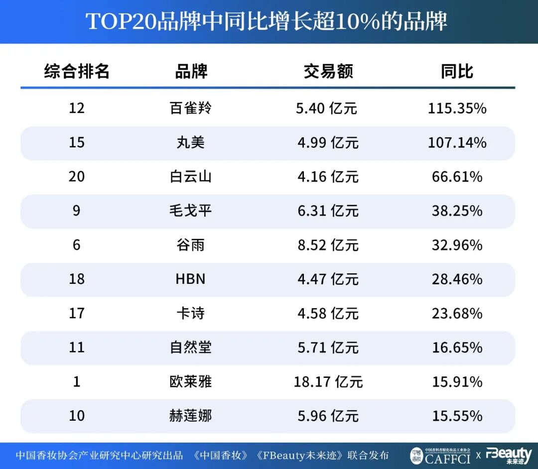 TOP20品牌中,保持10%以上高增长的品牌整体上以国货为主,欧莱雅和赫莲娜是唯二的外资品牌。