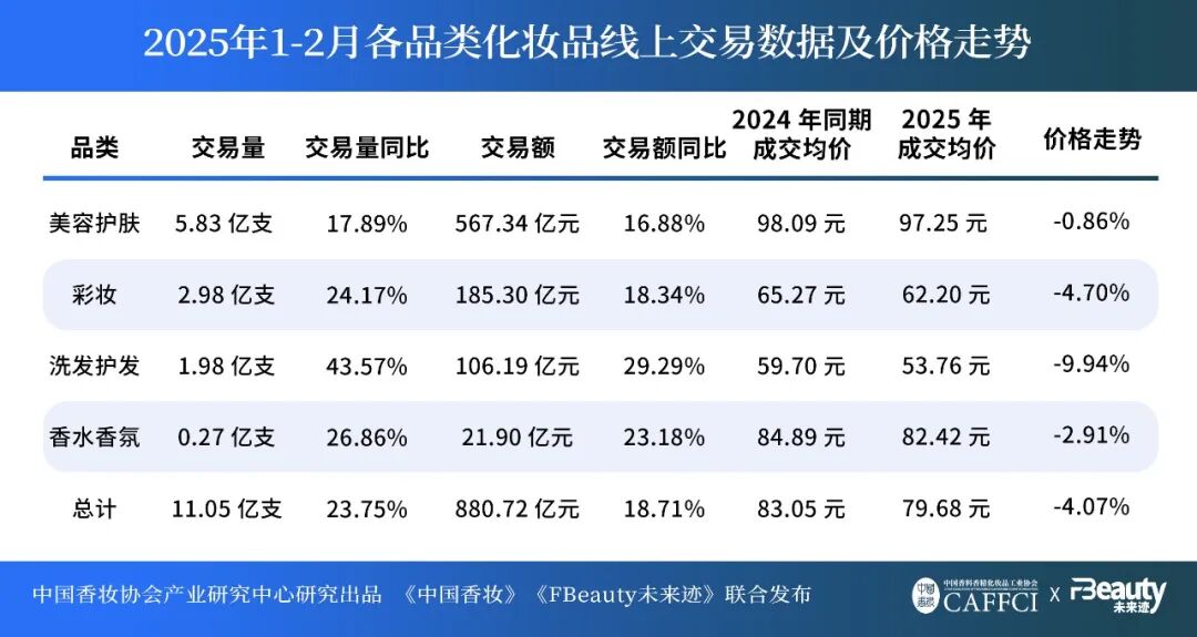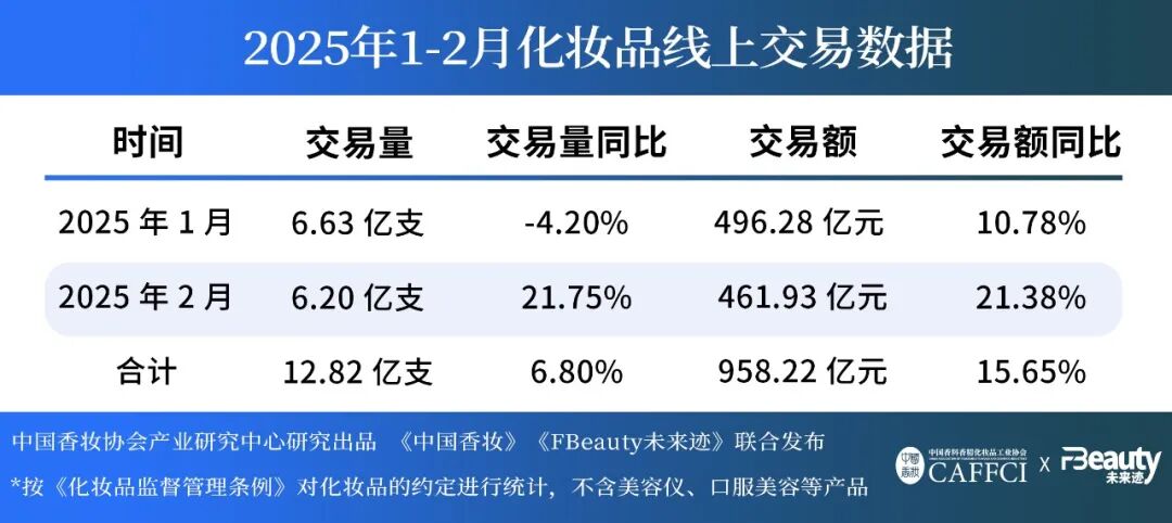 结合1月数据,2025年1-2月,化妆品线上交易总额为958.22亿元,同比增长15.65%;交易总量为12.82亿支,同比增长6.8%。