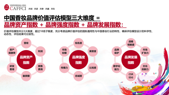 中国香妆协会经过近一年时间,历经讨论酝酿、文献检索、专家论证、课题研究、预实验等多阶段科学过程,才形成了这套“中国香妆品牌价值评估系统”。该系统既符合中国香妆行业特点,又与国家标准和国际通行做法相统一。其评估模型共分品牌资产指数、品牌强度指数、品牌发展指数等3大维度,超过18项子维度,充分考虑品牌价值评估的国际通用性与中国香妆行业的特性,确保了评估模型设计的科学性、动态性以及评估结果的可比较性,为中国香妆品牌价值的衡量提供了可靠依据 。
