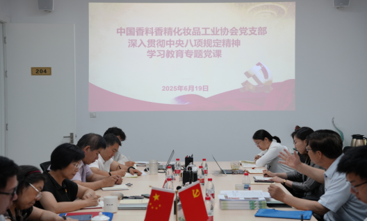 为深入贯彻落实中央八项规定精神,进一步加强作风建设,按照党中央统一部署和中社部工作要求,2025年6月19日,中国香料香精化妆品工业协会(以下简称:中国香妆协会)党支部书记颜江瑛为中国香妆协会党支部全体党员和员工讲授了题为《持之以恒落实八项规定精神转作风提能力助推香妆行业高质量发展》的专题党课。中国轻工业联合会(以下简称:中轻联)副秘书长朱念琳到会指导。
