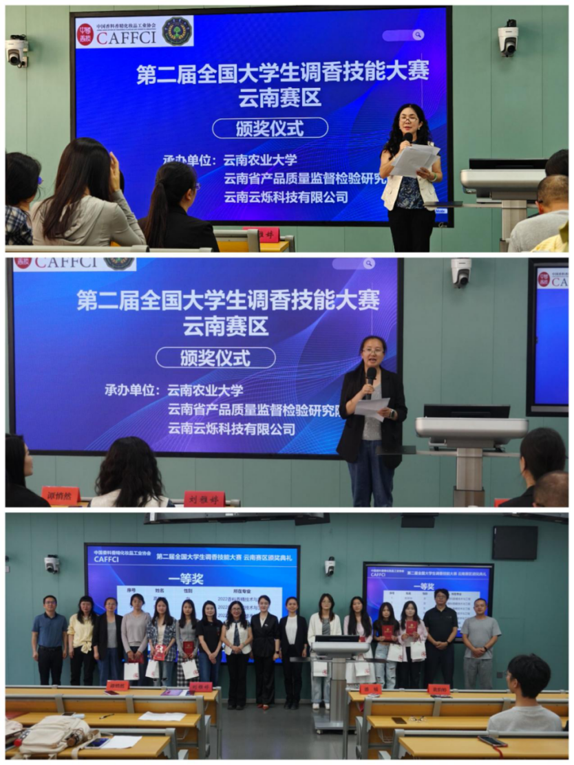 颁奖仪式于当日下午举行。云南农业大学烟草学院院长刘雅婷出席并致辞,对赛事的成功举办及选手们的精彩表现给予高度肯定。刘雅婷院长、云南云烁科技有限公司董事长助理兼副总经理谭悄然、云南省产品质量监督检验研究院高级工程师潘媛、工程师黄韵婷,昆明海关技术中心综合业务部部长王裔耿共同为获奖学生颁奖。获奖学生代表高慧怡上台分享参赛心得,真挚讲述了备赛过程中的成长与收获。仪式上,云南农业大学烟草学院香料香精技术与工程专业系主任保志娟详还详细介绍了2025年决赛的筹备安排,点燃了师生对后续赛事的热切期待。