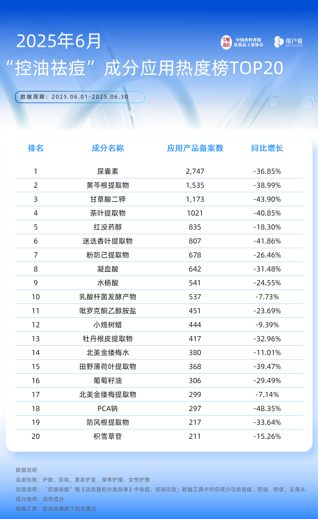 本期控油祛痘TOP20产品备案数同比均下降,尿囊素、黄芩根提取物和甘草酸二钾分别以2747件、1535件和1173件位于本期前3名,但三者备案数量相较5月均出现下降。PCA钠备案数量有所增加,但同比降幅最大,为-48.35%,并且排名跌至第18位。