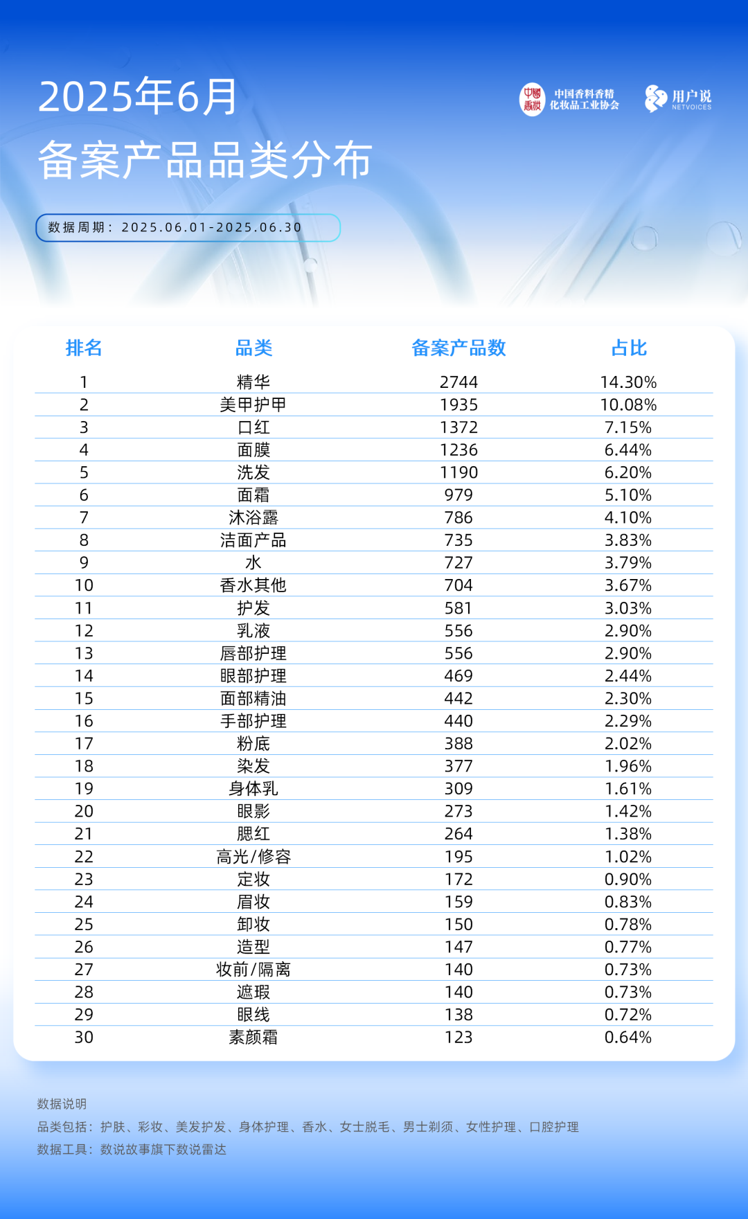 为深入解析行业趋势,中国香妆协会产业研究中心联合《中国香妆》与《用户说》两大权威平台,基于2025年6月备案数据开展专项研究,联合发布本期成分原料洞察。本期将从6月备案产品的变化趋势、备案成分、主要功效出发,为行业参与者提供科学的决策依据,助力品牌在产品研发、市场定位等方面做出更精准的判断。