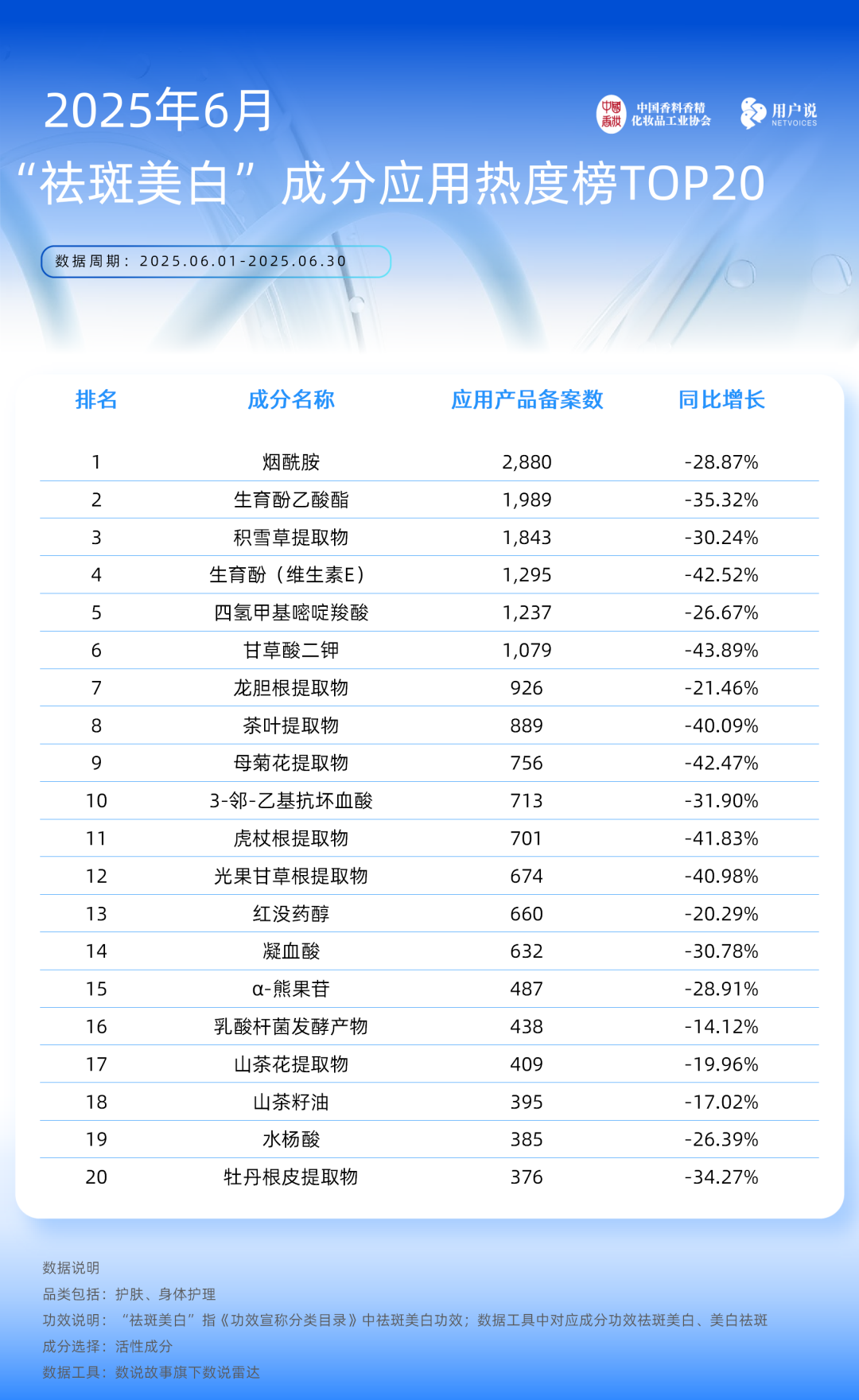 2025年6月活性成分备案热度整体出现下滑,TOP20同比均无增长,但相较5月,平均同比跌幅有所收窄,市场趋于稳定。TOP5成分依旧稳定占领榜单,分别为透明质酸钠(7889件)、烟酰胺(4530件)、生育酚乙酸酯(4196件)、尿囊素(4144件)、泛醇(3961件)。