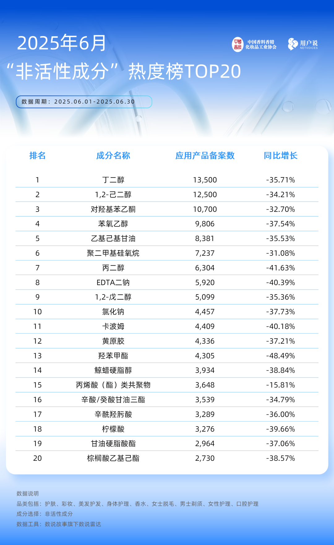 2025年6月非活性成分热度TOP20同样出现下滑,丁二醇以13500件的备案数继续占领榜首。由于季节更替导致的消费者需求变化,部分较为厚重的成分如丙二醇(6304件)等保湿剂需求下降,而辛酸/癸酸甘油三酯(3539件)等轻质润肤剂备案数量增长,同比增长回升至-34.79%。