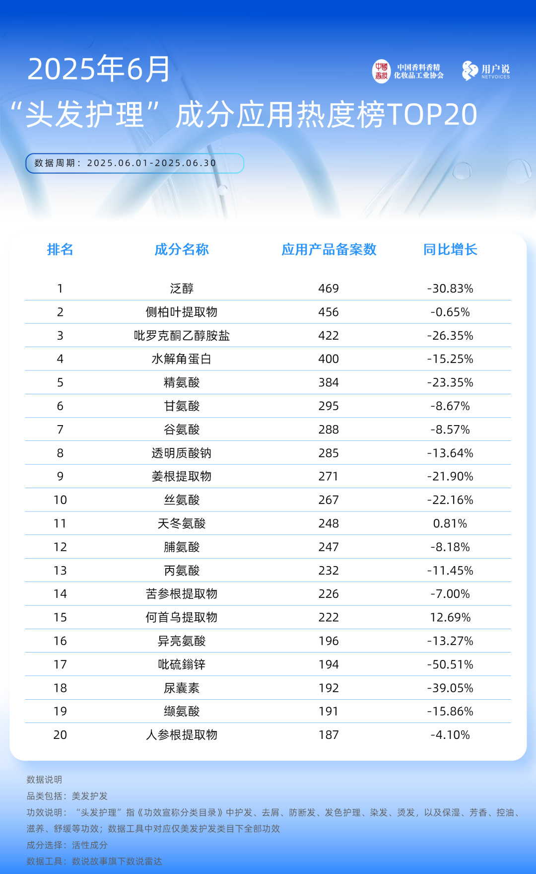 缬氨酸时隔两月再次入榜,替代了5月上榜的乳酸钠。缬氨酸与其他氨基酸相仿,有调理皮肤的功能,同时可保湿、活血和加快创伤愈合。乳酸钠主打去角质,刺激性较强,而缬氨酸是典型小分子氨基酸,更为温和。缬氨酸的再次入榜,表明大众对温和型成分关注度增加,此类成分或将成为头发护理市场的主导。