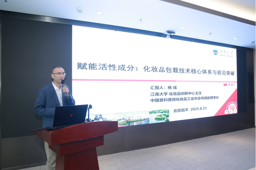 江南大学教授杨成以《赋能活性成分:化妆品包载技术核心体系与前沿突破》为题,介绍了化妆品中生物活性成分在抗皱、美白、祛痘等功效中的应用及其面临的渗透性、稳定性等挑战。重点阐述了脂质体技术、固体脂质纳米粒(SLN)、纳米结构脂质载体(NLC)、高分子微胶囊等包载体系在提升活性成分生物利用度、实现控释与靶向递送方面的核心作用,并展示了多项创新案例。此外,杨成教授还前瞻性地介绍了基于细胞膜蛋白仿生策略的靶向递送系统,通过微流控技术实现精准美白与抗皱应用,标志着化妆品包载技术正向智能化、仿生化和高效化方向迈进。
