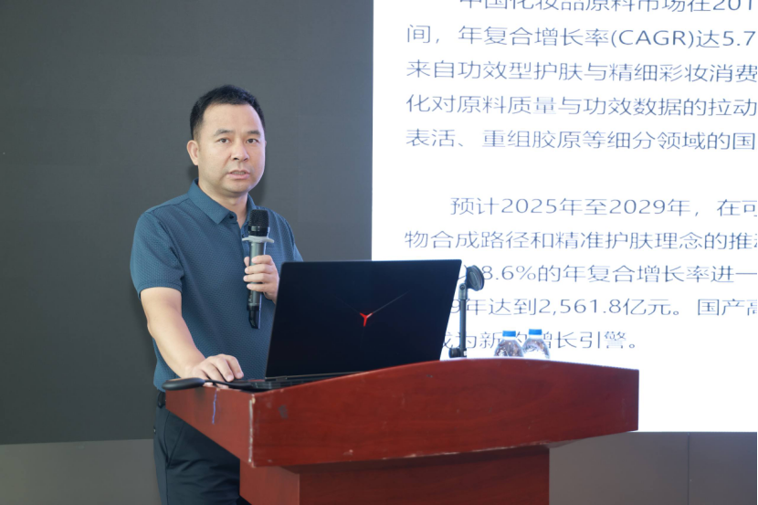 沈阳化工研究院化工新材料研究所所长柴宝山做题为《国产高值化妆品原料的创新方向与路径》的分享,介绍了中国化妆品原料行业的发展趋势、技术路径与创新成果。随着消费升级、法规强化以及国产替代加速,我国化妆品原料行业呈现高端化、功能化、绿色化三大趋势,合成生物学、植物提取工艺、生物发酵技术及AI辅助研发等也已成为我国化妆品原料创新的核心。
