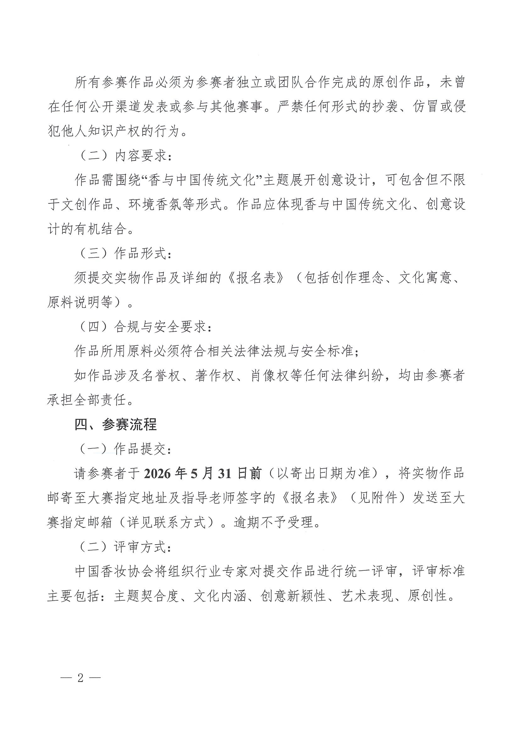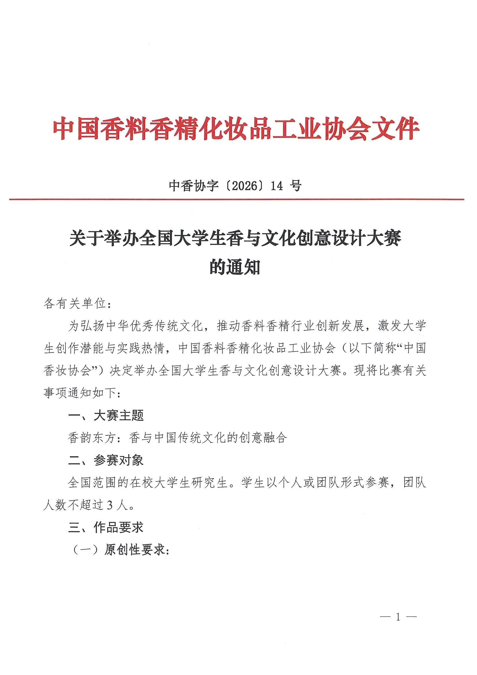 为弘扬中华优秀传统文化,推动香料香精行业创新发展,激发大学生创作潜能与实践热情,中国香料香精化妆品工业协会(以下简称“中国香妆协会”)决定举办全国大学生香与文化创意设计大赛。现将比赛有关事项通知如下: