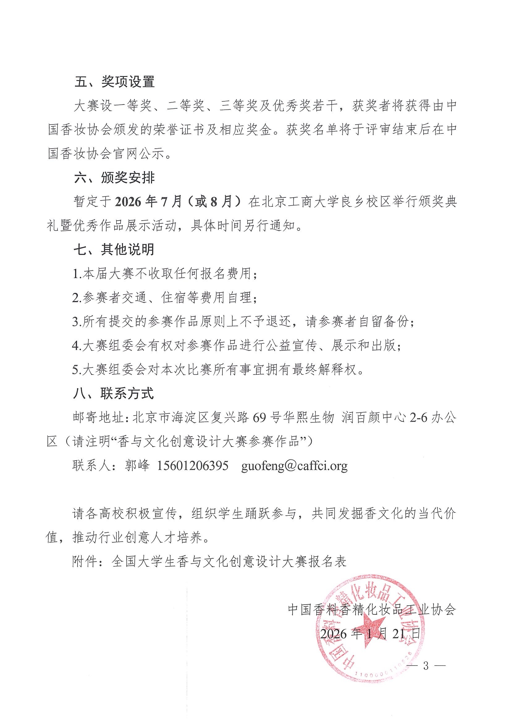 为贯彻落实国家关于推动科技创新与产业创新深度融合、深化产教融合的战略部署,加快培养香料香精领域高素质技术技能人才,推动行业产学研协同创新,中国香料香精化妆品工业协会(以下简称“中国香妆协会”)联合北京工商大学、河南农业大学、上海应用技术大学、云南农业大学、江西水利电力大学共同举办“第三届全国大学生调香技能大赛”现将大赛相关安排通知如下:
