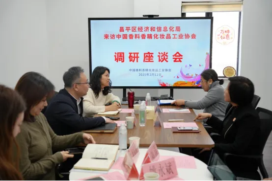 2月12日上午,昌平区经济和信息化局局长金鑫、副局长张宏鸽、区美丽健康工作推进专班办公室黄丽丽、区美丽健康工作推进专班办公室陈梦到访中国香料香精化妆品工业协会(以下简称:中国香妆协会)开展调研座谈,中国香妆协会颜江瑛理事长、董树芬顾问、副秘书长兼化妆品部主任刘洋、产业研究中心兼综合信息部主任姚永斌一同参加座谈。