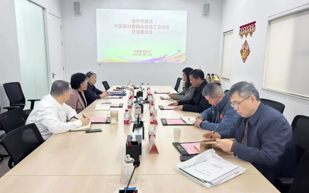3月17日上午,咸宁市政协党组成员、副主席黄文一行到访中国香料香精化妆品工业协会(以下简称:“中国香妆协会”),中国香妆协会颜江瑛理事长、董树芬顾问、穆旻秘书长、香料香精部刘华主任、咸宁市政协郑光勇副秘书长及有关同志一同参加座谈。