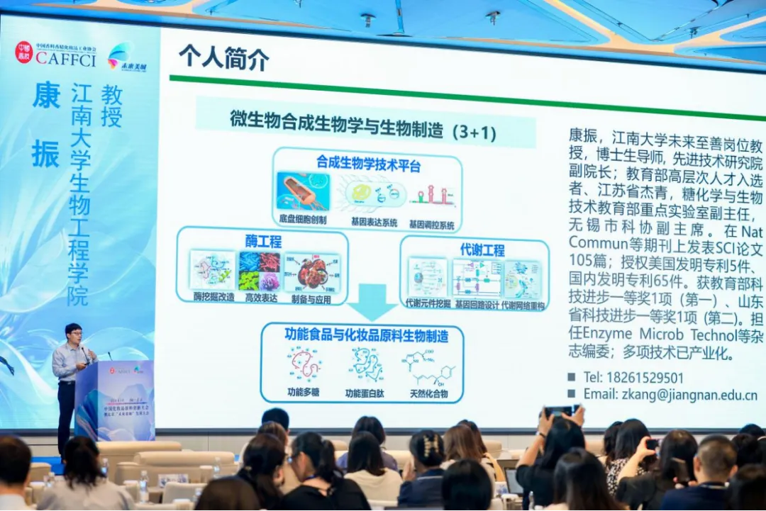 江南大学生物工程学院康振教授,以《生物合成技术在化妆品原料创新中的应用》为题,阐述合成生物学技术发展及化妆品原料研用趋势,并对不同分子量透明质酸、硫酸软骨素和肝素、寡肽,以及抗氧化防晒化合物的生物制造进行了详细介绍。同时,指出随着合成生物学技术的不断发展,其在化妆品原料生产中的应用将越发广泛,并将契合化妆品作为日用消费品所具有的迭代快的特点,更有利于加速化妆品行业的源头创新速度,为化妆品行业的高质量发展助力。