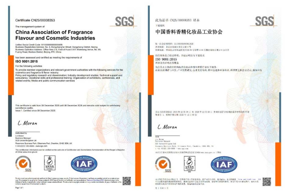 2025年12月份中国香料香精化妆品工业协会(以下简称中国香妆协会)正式获得ISO 9001:2015质量管理体系国际标准认证证书,成为国内率先通过国际权威质量认证的行业协会之一。这标志着中国香妆协会在规范化、标准化、国际化的质量管理道路上取得了里程碑式的进展,综合管理体系与服务能力已达到国际认可的水平。